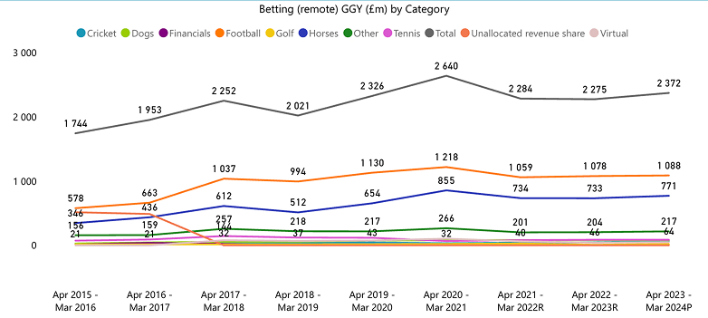 Nettivedonlyönnin puolella jalkapallo toi 1,1 miljardia (eli noin Suomen kokonaismarkkinan verran) ja hevosurheilu 771 miljoonaa puntaa.