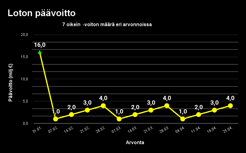 Loton päävoitto ei mennyt lauantaina 18.4. jakoon. Se tarkoittaa että lauantaina 25.4 päävoitto on 4 miljoonaa euroa.