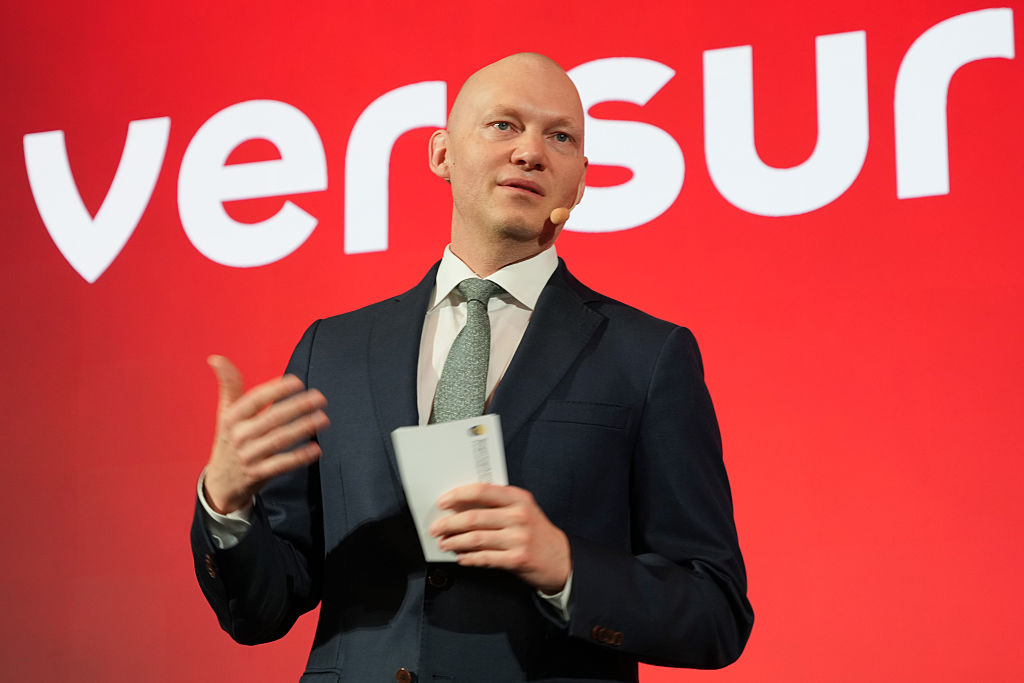 Niklas Wykman, Ruotsin rahoitusmarkkinaministeri, Verisure-yhtiön pörssilistautumisen yhteydessä Nasdaqin Tukholman pörssissä 8. lokakuuta 2025. Listautumisanti keräsi noin 3,2 miljardia dollaria ja vahvisti Tukholman asemaa Euroopan vilkkaimpana listautumismarkkinana. (Kuva c Erik Flyg/Bloomberg via Getty Images.)